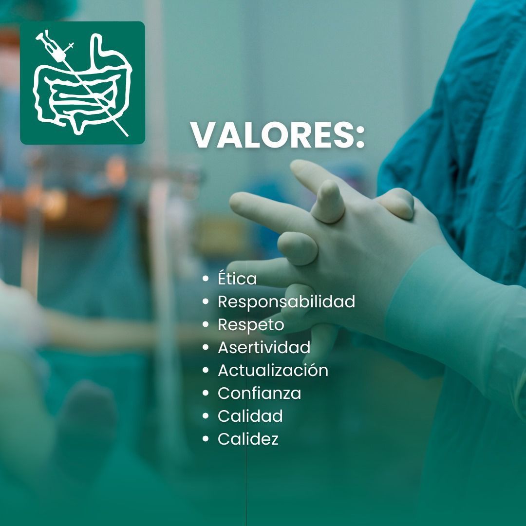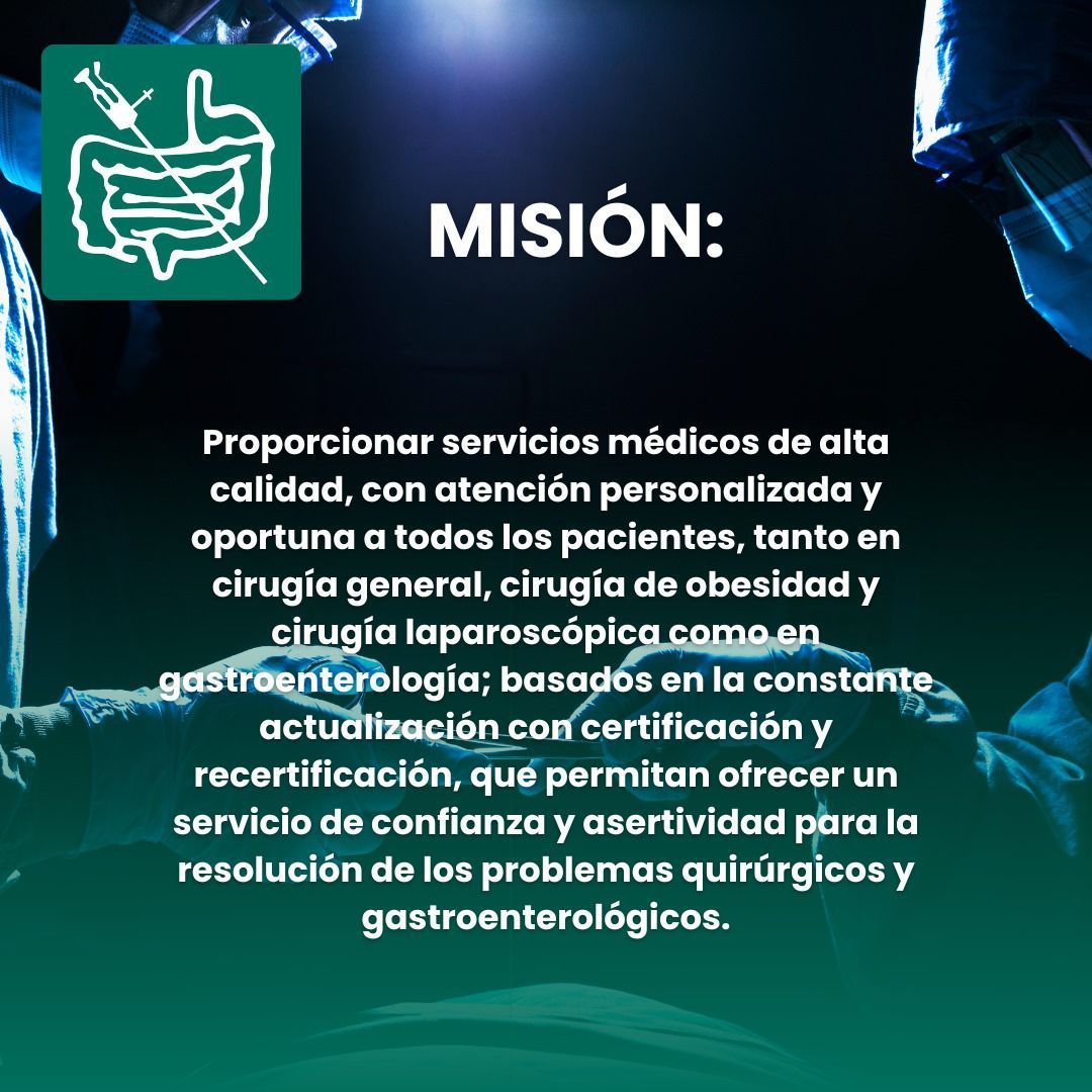 Proporcionar servicios médicos de alta calidad, con atención personalizada y oportuna a todos los pacientes, tanto en cirugía general, cirugía de obesidad y cirugía laparoscópica como en gastroenterología; basados en la constante actualización con certificación y recertificación, que permitan ofrecer un servicio de confianza y asertividad para la resolución de los problemas quirúrgicos y gastroenterológicos.