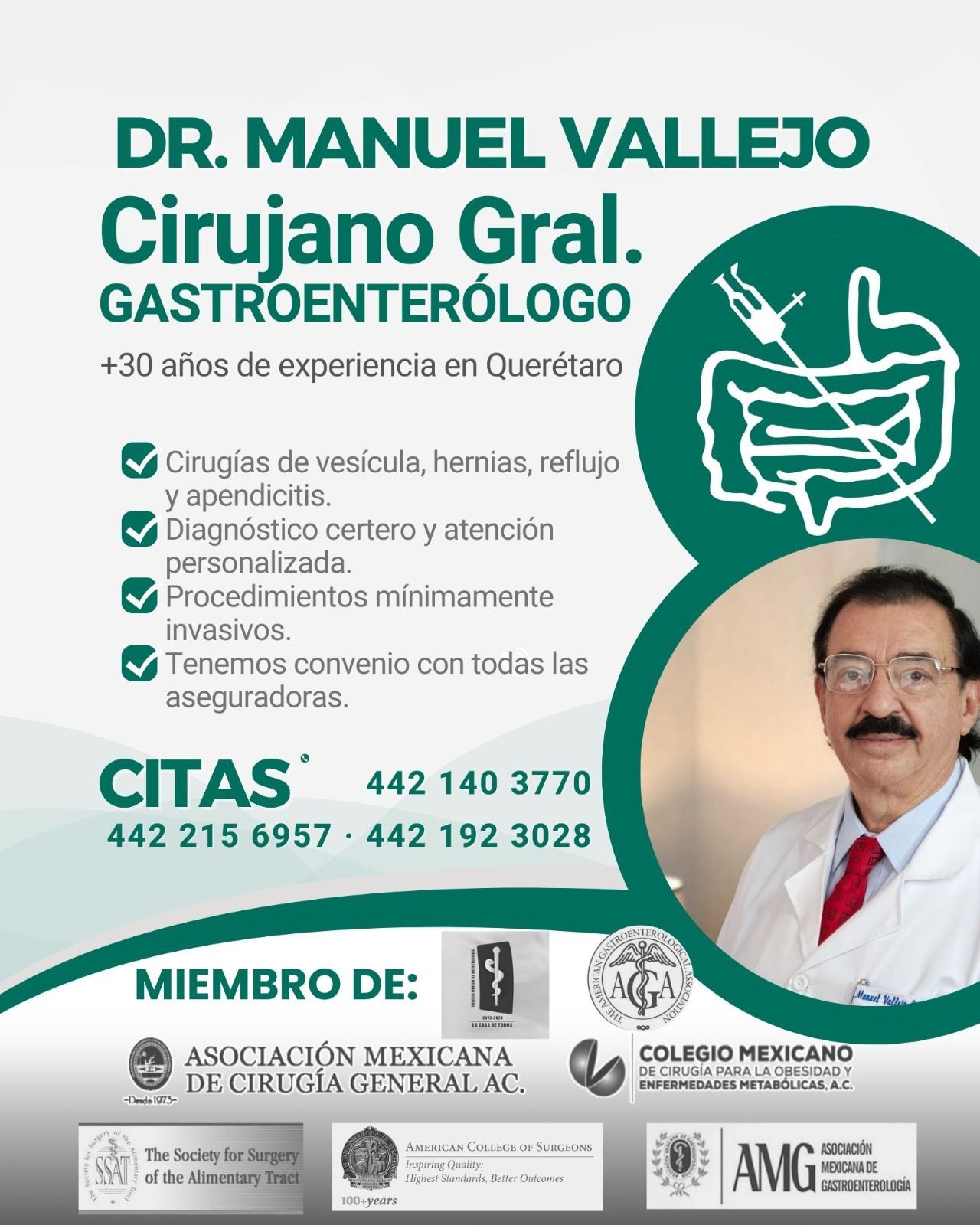 El DR. MANUEL VALLEJO SOTO realiza todo tipo de intervenciones para solucionar padecimientos, como cánceres del tubo digestivo y biopsias de glándula mamaria.